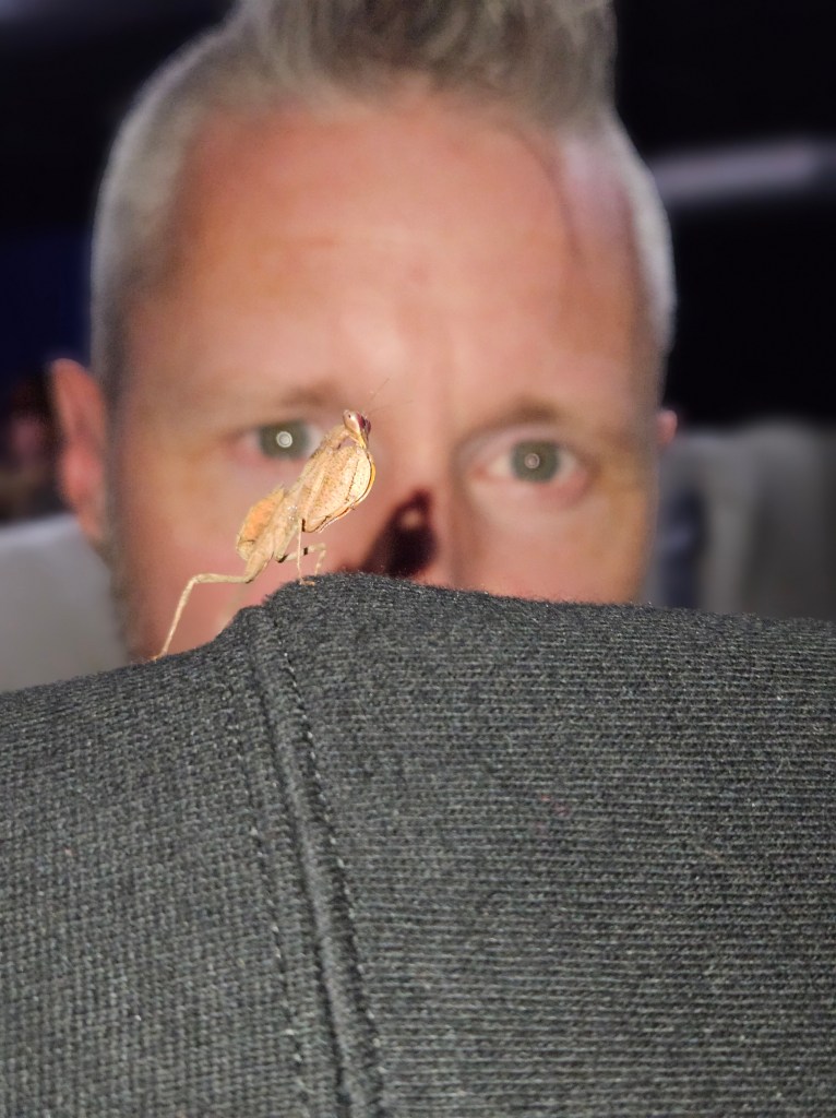 We still had a ways to go, so we shut all the windows and pulled the curtains shut as the tree branches reached in like a monster trying to get us as we went. We noticed too we’d picked up a hitchhiker- a (we’d find out from Mat later) flower mantis. A praying mantis about 2 inches long who seemed very confused. He/ she was wagging their head and dancing back and forth while we all did a little photo shoot with it. You can even see its face and tiny little red eyes.