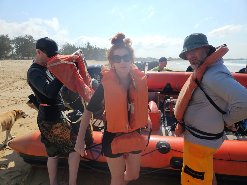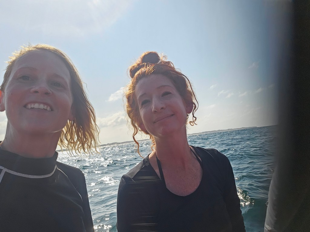 The ride was a bit crazy- the waves were insane and it was pretty rough. I imagined that it was more of a ride than perhaps some people bargained for- including Kristin. She was always sailing with her family when she was young so being on the water wasn’t so scary but it was definitely still challenging her comfort zone. We had joked about this little girl whose dad mic’ed her up for this TikTok that went viral where she was snowboarding and singing to herself, “It’s ok if I fall, it’s super fun and it’s good” or something like that…so I started singing jokingly to Kristin to make her laugh- and the girl next to me (Gail, from South Africa I’d find out later) was like are you singing? And I told her the story which made her laugh too.