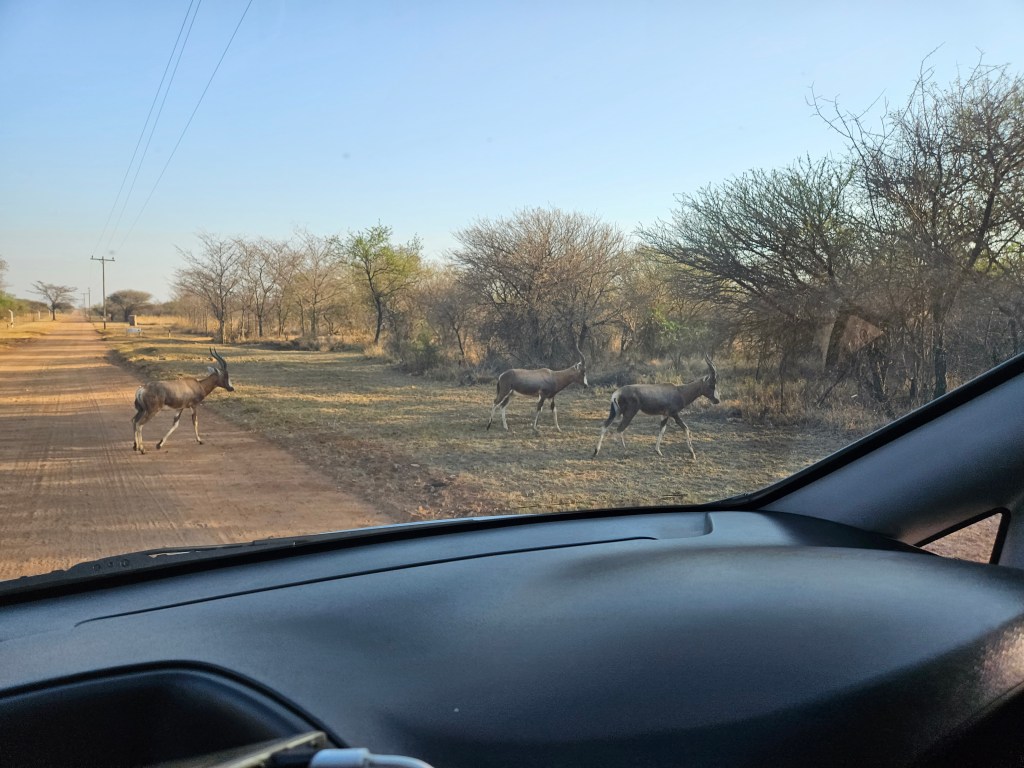We noticed there were quite a few other game reserves- and almost right off the bat we saw the Blesbok- the “purple’ antelope Mat had mentioned. The one that was nearly excinct and being brought back by hunters on their reserves- but not only were they inside a fence on one side but also in the road, so I’m not sure what that’s about- or I guess as we’d already passed through one fence, there must be a larger reserve that also contains the smaller ones.