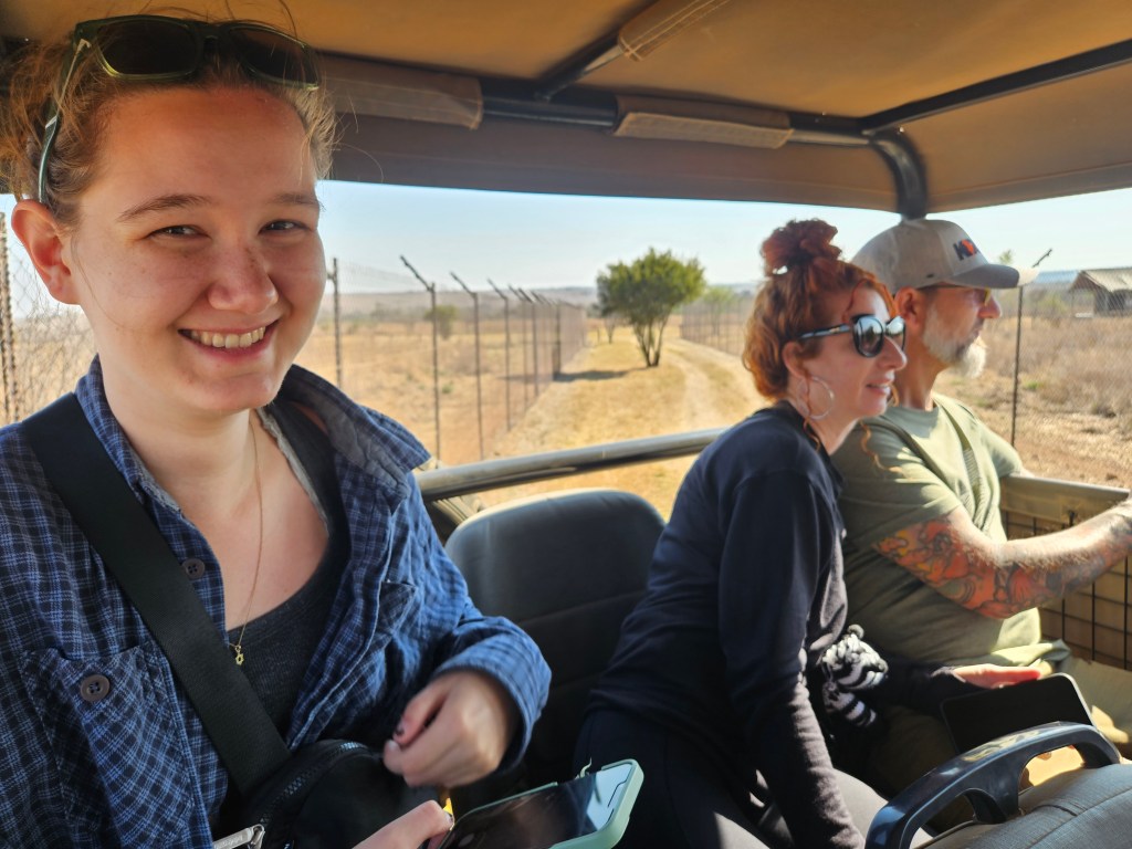 An open safari Land Rover truck came by with a guy driving and let us in, and we took off down some more dirt roads. As we approached another gate we saw there was a lion laying near the corner of that area- not in an enclosure…and we realized that this was indeed part of a larger reserve and this guy was not inside the KRF one but rather was a wild lion from the reserve just hanging out which was interesting- and explains why the sign on the gate said there were wild animals around and it wasn’t advised to get out of your truck!